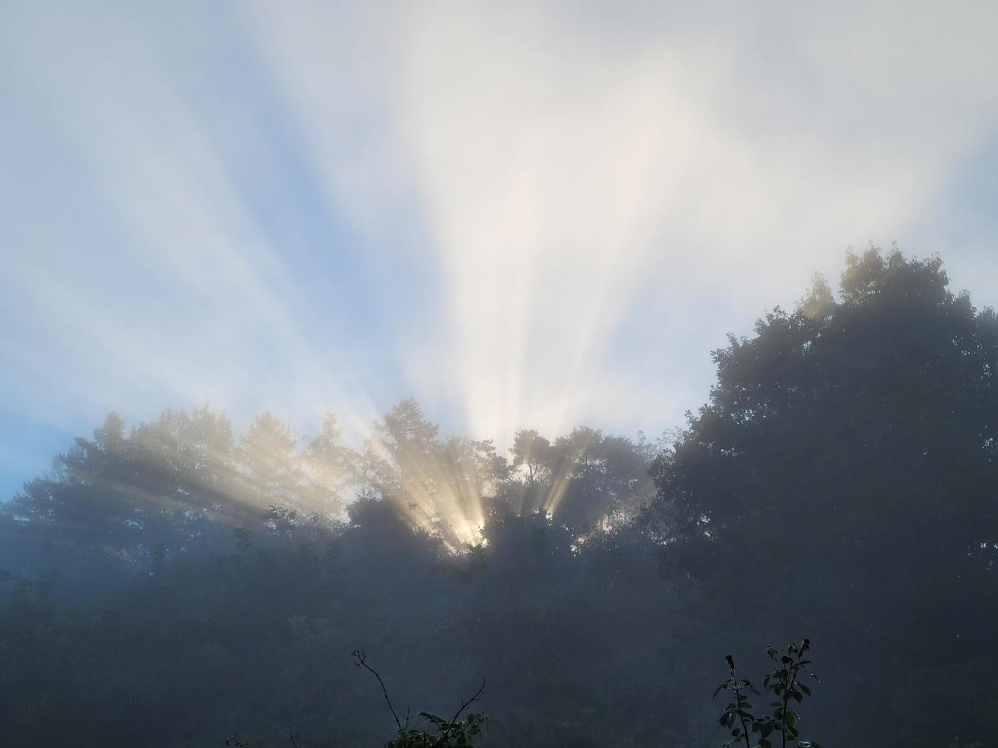 이미지 설명: 아침 햇살이 구름 사이로 비치는 섬광 현상